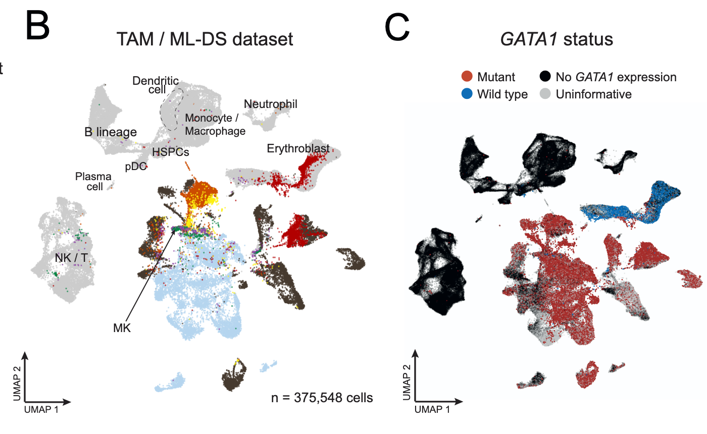 We examined the relationship between the genetic and transcriptional evolution of ML-DS from natural variation using single cell sequencing.