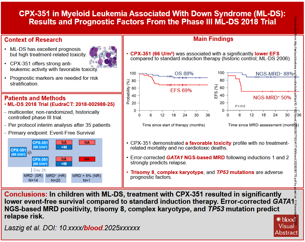 Laszig, S., Diedrichs A. et al., CPX-351 in Down Syndrome-associated Myeloid Leukemia: Results and Prognostic Factors from the Phase III ML-DS 2018 Trial, Blood 2025; nlood.2025030775. doi: Https://doi.org/10.1182/blood.2025030775